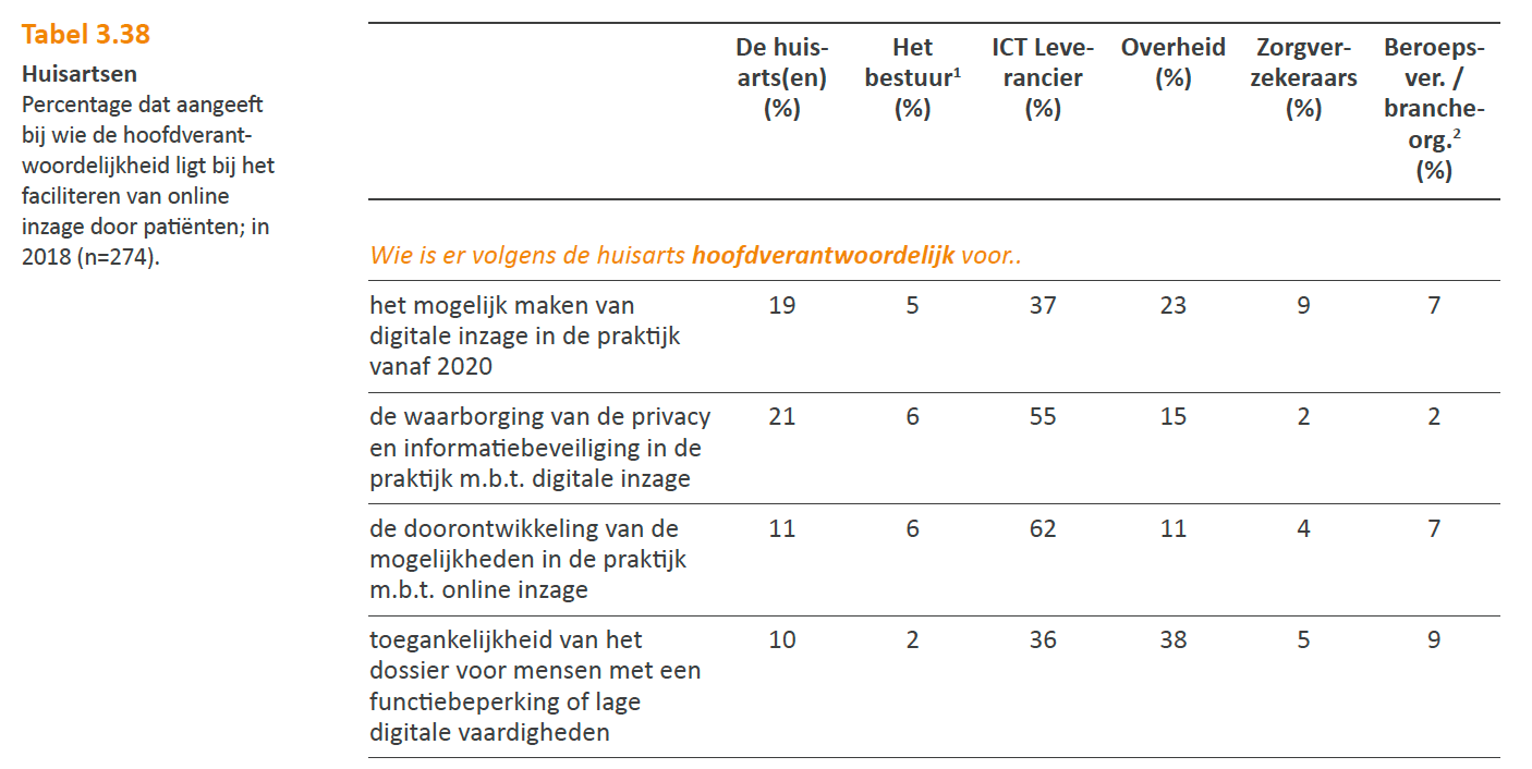 Wanneer we die politieke doelstellingen links laten liggen, en vooral naar het cijfermateriaal op zich kijken, dan biedt de eHealth monitor veel achtergrondinformatie. De tabellenbijlage bevat een schat aan gegevens, die niet allemaal hun weg vonden naar het samenvattende rapport. Die vragen bieden meer inzicht in het achterblijven van inzage door zorgconsumenten in het medisch dossier. Neem bijvoorbeeld tabel 3.39. Herbij wordt aan medisch specialisten gevraagd bij wie volgens hen de verantwoordelijkheid ligt voor het faciliteren van online inzage.
