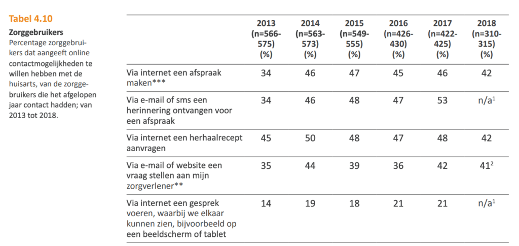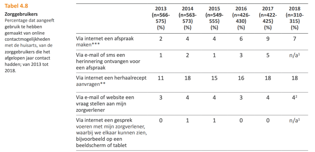 Bij diensten die zorgaanbieders aanbieden, zoals dossier-inzage of online afspraken maken, is het dominante beeld dat uit de monitor naar voren komt al jaren stabiel: patiënten zeggen desgevraagd dat ze die diensten willen, dokters zeggen dat ze deze wel degelijk aanbieden, maar de patiënt blijkt ze in de praktijk maar mondjesmaat te gebruiken. Er zijn waarschijnlijk veel factoren die meespelen in deze mismatch tussen vraag en aanbod.